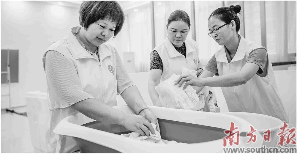 廖靈香(左)、周仕萍(中)、葉藝芬(右)在交流嬰兒護(hù)理經(jīng)驗(yàn)。南方日?qǐng)?bào)記者 王昌輝 攝