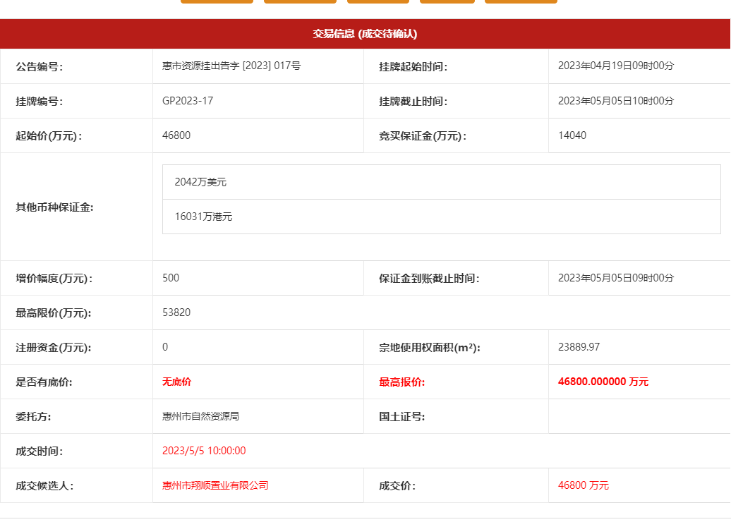 5日上午,經(jīng)過競價,該地塊由惠州市翔順置業(yè)有限公司最終以46800萬元價格摘得,樓面價約5068.6元/平方米。