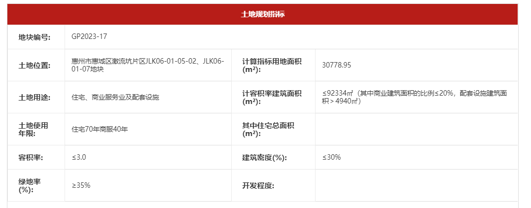 據(jù)惠州市公共資源交易中心土地與礦業(yè)網(wǎng)上掛牌交易系統(tǒng)信息顯示,該地塊由惠州市自然資源局委托出讓,地塊位于惠州市惠城區(qū)激流坑片區(qū)JLK06-01-05-02、JLK06-01-07地塊,宗地使用權(quán)面積23889.97平方米,計算指標用地面積30778.95平方米,最大計容積率建筑面積92334平方米。