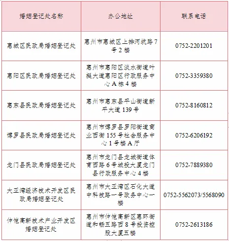 附:惠州市各婚姻登記處辦公地址及聯(lián)系電話
