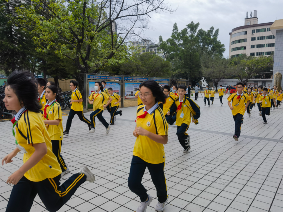 活動(dòng)開展防踩踏應(yīng)急疏散演練,學(xué)生從教室撤離到操場(chǎng)。