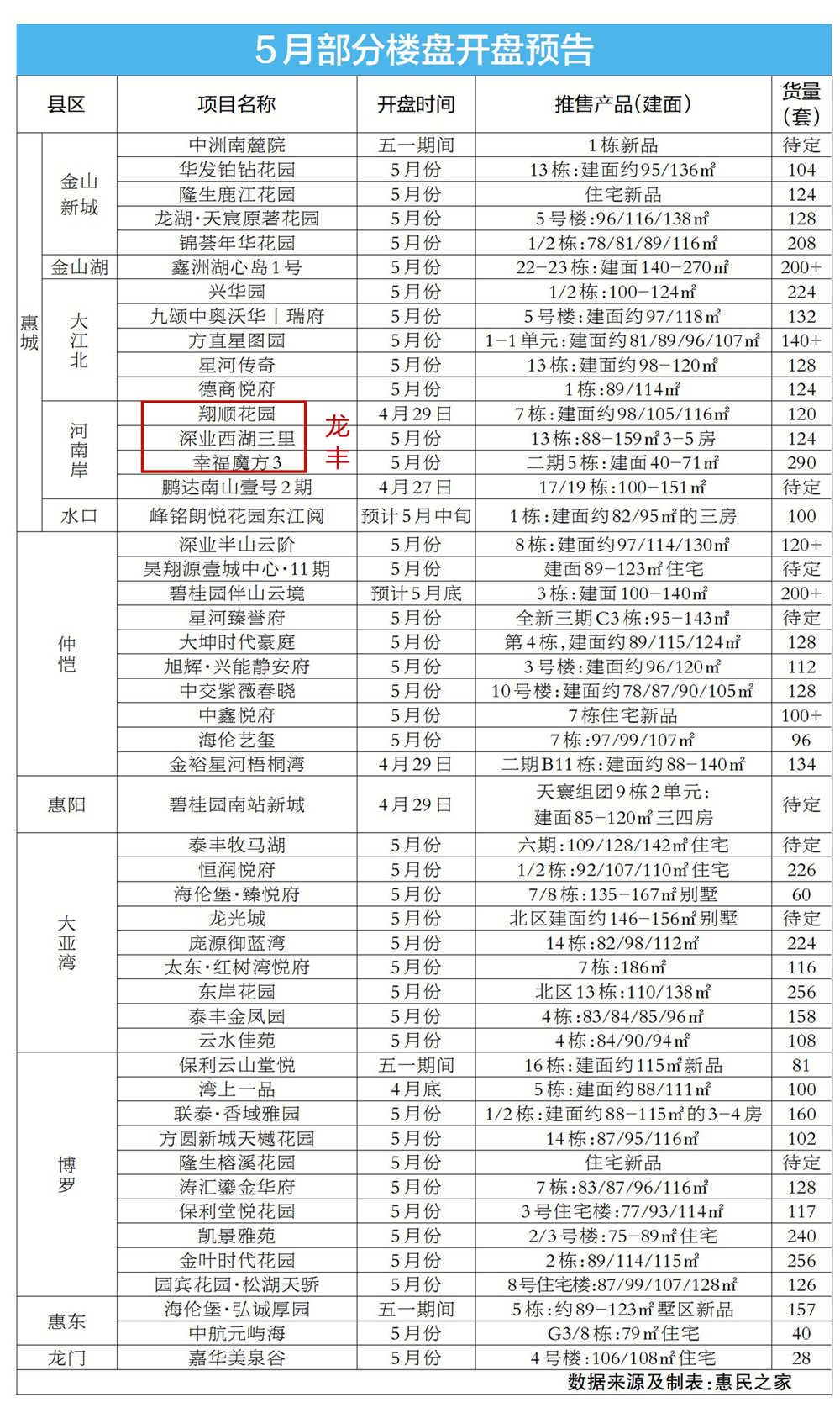 通過開展“宜居惠州 安家惠城”明星樓盤惠民購房節(jié)暨辦證抽大獎(jiǎng)等活動(dòng),“五一”期間惠城區(qū)熱點(diǎn)在售樓盤日均到訪量和認(rèn)購量環(huán)比上行明顯。市場(chǎng)成交活躍,進(jìn)一步帶動(dòng)了開發(fā)商的推貨熱情;菝裰覕(shù)據(jù)監(jiān)控中心統(tǒng)計(jì)顯示,惠城本月預(yù)計(jì)將有16盤推新,超2300套新房入市,新品主要集中在金山新城、江北及河南岸3個(gè)片區(qū)。