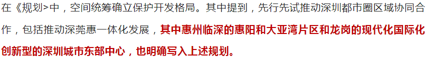 《規(guī)劃》提出空間統(tǒng)籌,確立保護(hù)開發(fā)格局。其中提到,先行先試推動(dòng)深圳都市圈區(qū)域協(xié)同合作,包括推動(dòng)深莞惠一體化發(fā)展,建設(shè)以“平湖+觀瀾+鳳崗+清溪+塘廈”為載體的產(chǎn)城協(xié)同一體化發(fā)展試驗(yàn)區(qū),與龍華共建面向深圳都市圈北部的綜合服務(wù)中心。與惠陽(yáng)、大亞灣地區(qū)形成產(chǎn)業(yè)聯(lián)動(dòng)、交通緊密、配套齊全的協(xié)同發(fā)展格局。