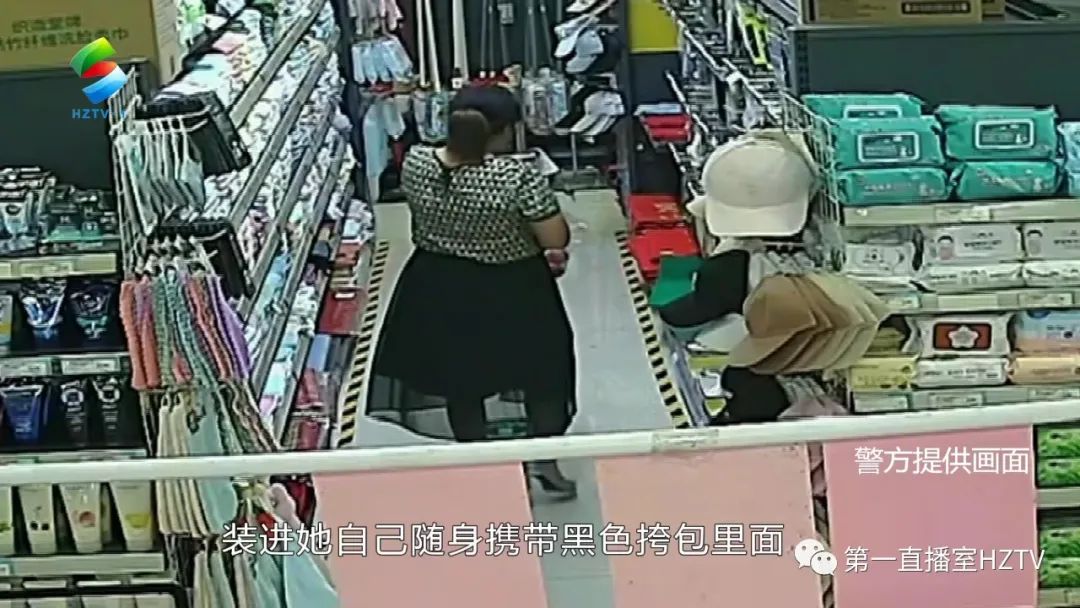 監(jiān)控顯示,事發(fā)當(dāng)天下午16點36分,一名黑衣女子出現(xiàn)在惠陽某超市內(nèi),她走走停停,眼睛一直在貨架徘徊,隨后她手里拿起一件藍(lán)色商品,在轉(zhuǎn)身瞬間,直接把商品塞進(jìn)隨身攜帶的手提包中。另外一邊,她又以同樣的手法,將肉和番茄塞進(jìn)包包中!