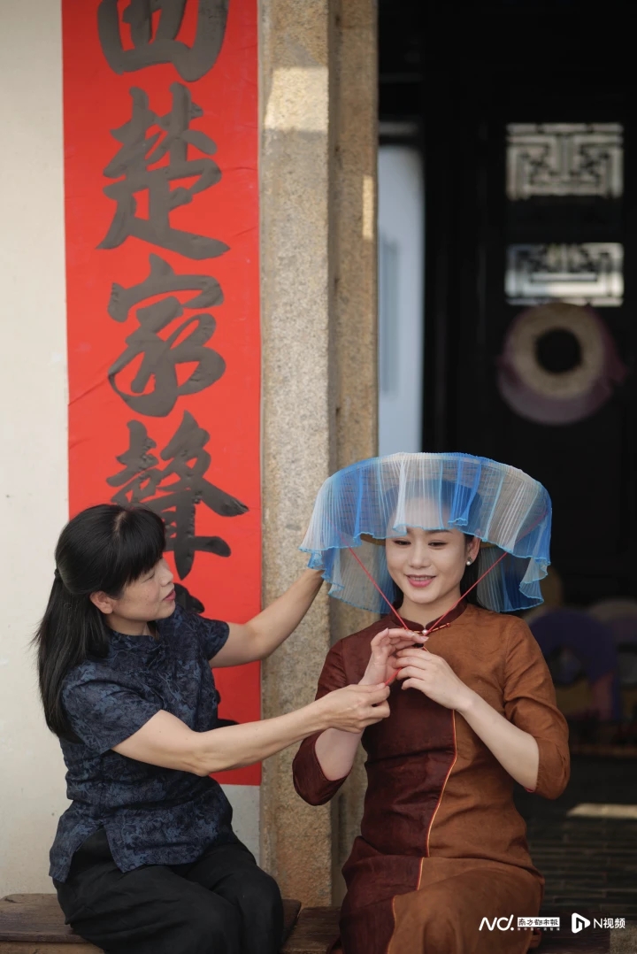 看著一個個經(jīng)過手工精心編織而成型的精致涼帽,曾小敏感嘆道:“每一道工序都需要細心耐心和巧手,客家女子的秀外慧中的美好品質(zhì)令人欽佩!彪S后,陳瑾瑜取一頂剛剛完工的“籮蓋花”花色涼帽為曾小敏戴上。這既輕巧、遮陽,又美觀、大方的涼帽,恰恰與曾小敏身著的中式香云紗搭配得相得益彰。“中開一孔”的設(shè)計,完美地適應著發(fā)髻,半透明的遮簾隨風飄搖垂在眼前,映襯著帽檐下女子溫潤的臉龐!按髌饋聿粌H有柔和、飄逸之感,還給人添了一分‘俠氣’!痹∶粽f。
