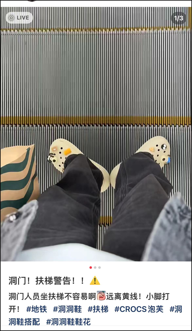 在知道穿洞洞鞋容易卷入扶梯之后,很多網(wǎng)友曬出了自己穿洞洞鞋坐扶梯的方式——