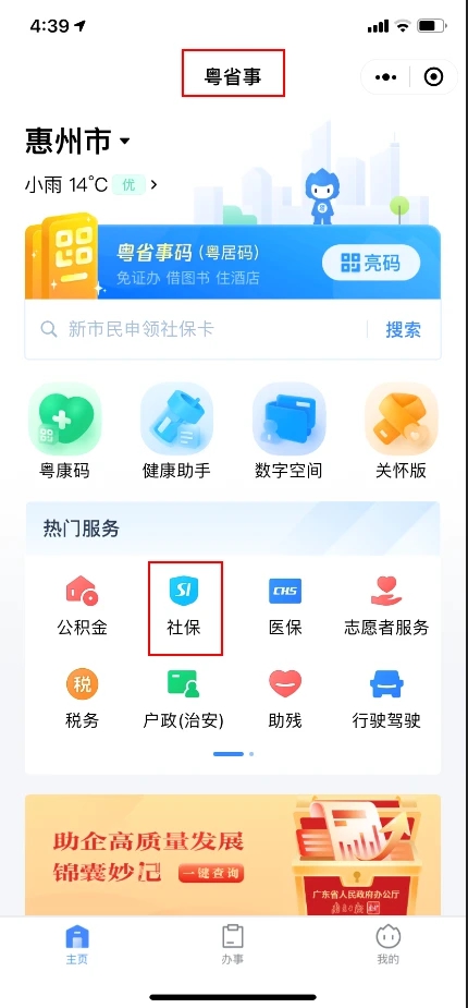 第一步:打開(kāi)微信搜索“粵省事”找到“社!钡卿泜(gè)人賬戶。