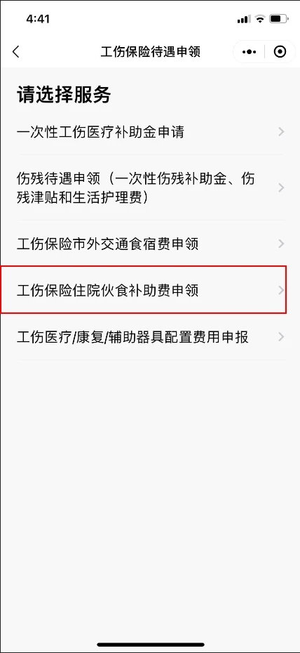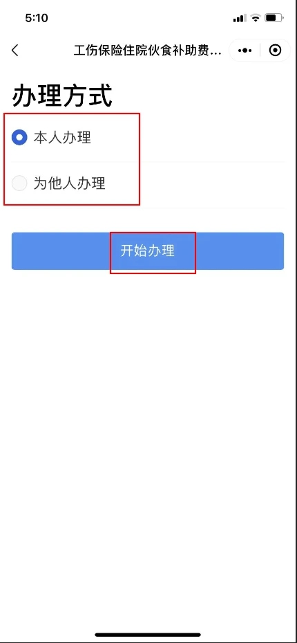 第三步:點(diǎn)擊“工傷保險(xiǎn)住院伙食補(bǔ)助費(fèi)申領(lǐng)”,根據(jù)提示授權(quán),授權(quán)完畢后開(kāi)始辦理(除“本人辦理”還可“為他人辦理”)。