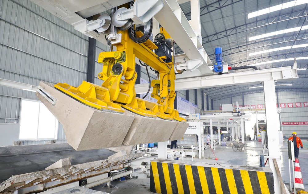 據(jù)介紹,該生產(chǎn)線包含鋼筋籠制作區(qū)、混凝土澆筑區(qū)、蒸汽養(yǎng)生區(qū)等六大功能區(qū),各區(qū)域由軌道串連成一個(gè)環(huán)形整體,區(qū)域間配備了機(jī)械臂、擺渡車和移動(dòng)小車,實(shí)現(xiàn)工序無縫銜接,從鋼筋籠到新澤西護(hù)欄成品,只需上車“走一圈”即可完成變身。