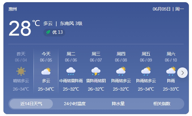 6月7日,我市天氣多云,有雷陣雨,局部雨勢(shì)較大,25~33℃;