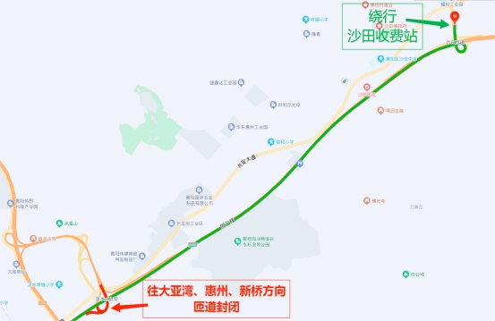 沈海高速(往汕頭方向)轉(zhuǎn)惠大高速車輛,可沿主線繼續(xù)行駛至沙田收費(fèi)站駛出,繞行G228國(guó)道至惠大高速淡水東收費(fèi)站駛?cè)搿?/p>
