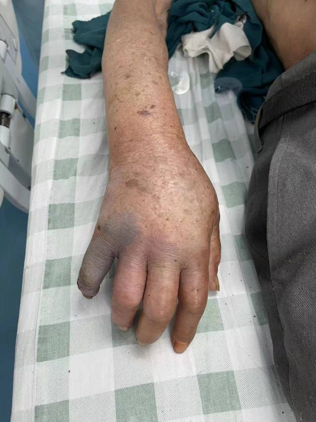 5月下旬,這名80多歲的患者余某(化名)被送往市一院蛇傷救治中心時,距離其被毒蛇咬傷手指已經(jīng)過去整整一天。在此之前,余某在當(dāng)?shù)氐摹吧哚t(yī)”處用藥酒清潔了傷口,并在手上敷上了厚厚的草藥。