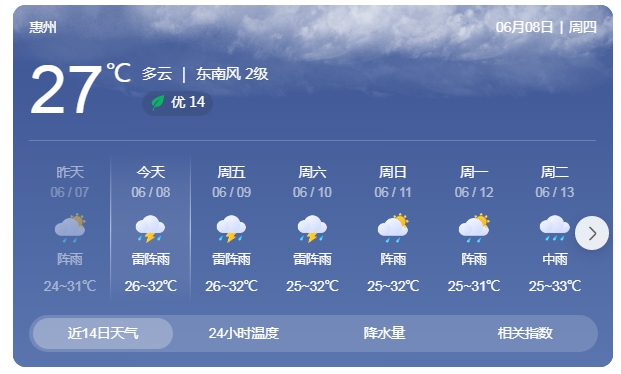 惠州市氣象臺6月8日07時發(fā)布,預(yù)計(jì),8日白天我市各地多云到陰天,有雷陣雨局部大雨,氣溫26~32℃,東南風(fēng)1~2級,相對濕度65%~98%。9日,多云,有雷陣雨,25~33℃。需注意防范局地強(qiáng)降水和強(qiáng)對流天氣對考生出行、考務(wù)組織和考場設(shè)備等可能帶來的不利影響。