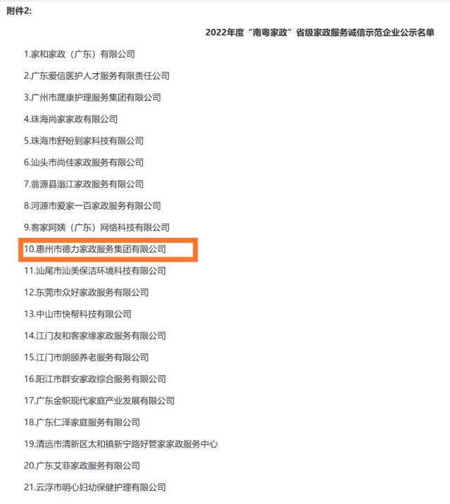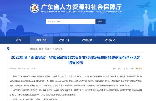 近日,記者從廣東省人力資源和社會保障廳獲悉,2022年度“南粵家政”省級家政服務(wù)龍頭企業(yè)和省級家政服務(wù)誠信示范企業(yè)認(rèn)定結(jié)果出爐。其中,惠州市德力家政服務(wù)集團(tuán)有限公司入選2022年度“南粵家政”省級家政服務(wù)誠信示范企業(yè)。