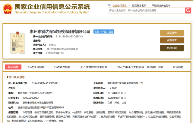 國家企業(yè)信用信息公示系統(tǒng)顯示,惠州市德力家政服務(wù)集團(tuán)有限公司成立于2019年9月,經(jīng)營范圍包括家政服務(wù)、洗染服務(wù)等。