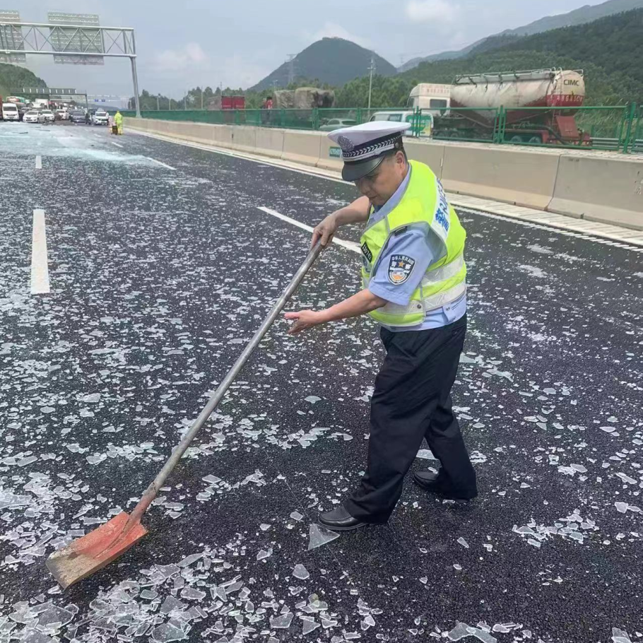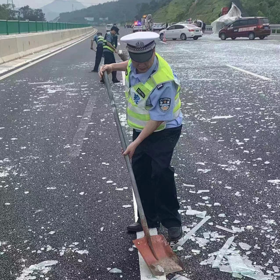 不久后,養(yǎng)護(hù)部門(mén)、拯救車(chē)輛陸續(xù)到達(dá),民警協(xié)同施救人員一起對(duì)現(xiàn)場(chǎng)進(jìn)行清理,冒著烈日高溫,利用鐵鏟、掃把等工具第一時(shí)間清理出一條安全車(chē)道供車(chē)輛行駛。繼續(xù)不停歇地打掃2小時(shí)后,路面上所有的碎玻璃及其他障礙物最終被徹底清理干凈,道路也恢復(fù)了正常通車(chē)。