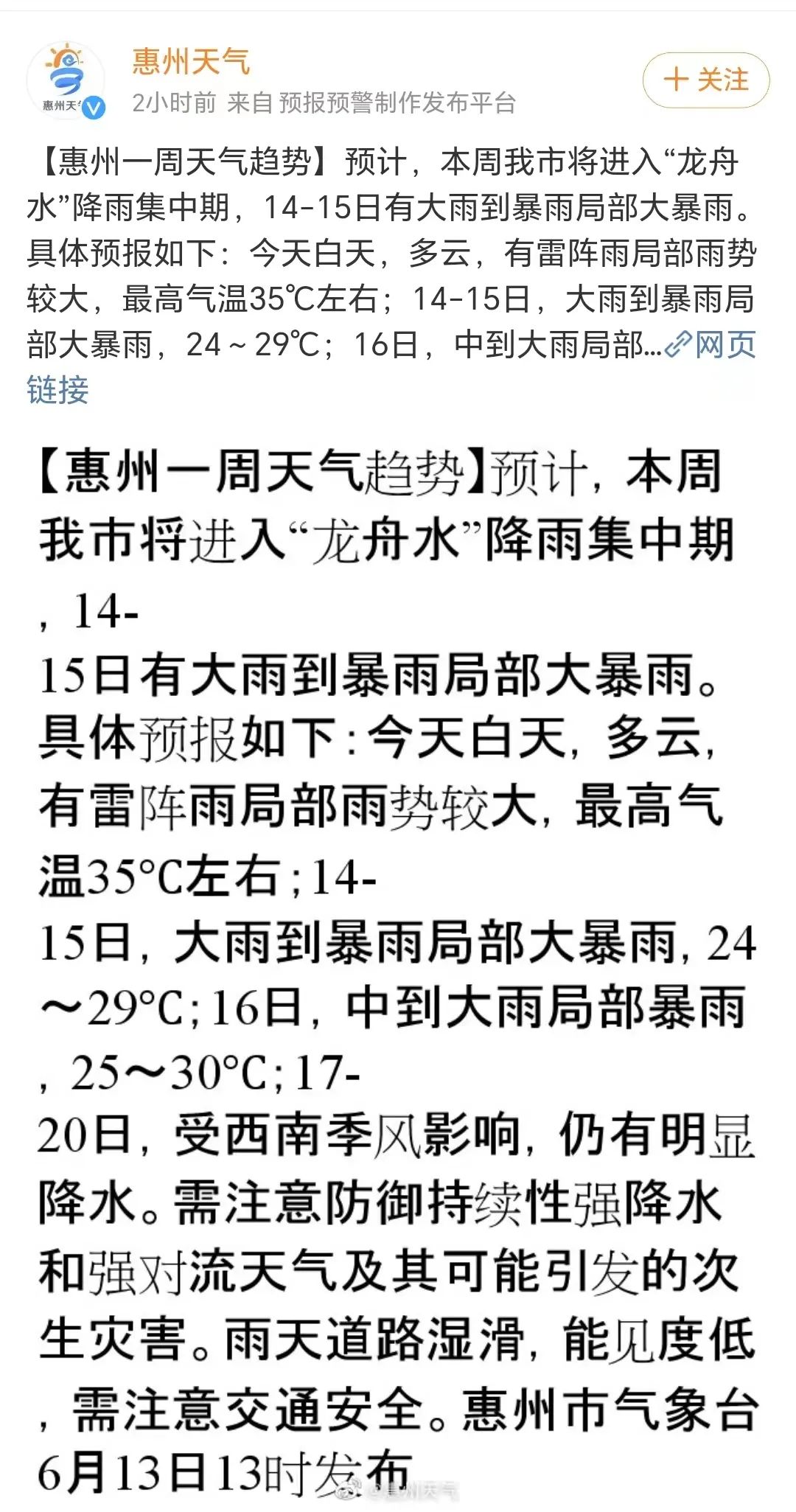 市氣象臺6月13日上午發(fā)布惠州重大氣象信息,預(yù)計本周我市進入今年“龍舟水”降雨集中期,14~15日有大范圍大雨到暴雨,局部大暴雨,并伴有短時強降水、雷電和8級左右短時大風(fēng)等強對流天氣,全市平均雨量60~100毫米,局部150毫米以上;展望16~18日受西南季風(fēng)影響,仍有明顯降水。