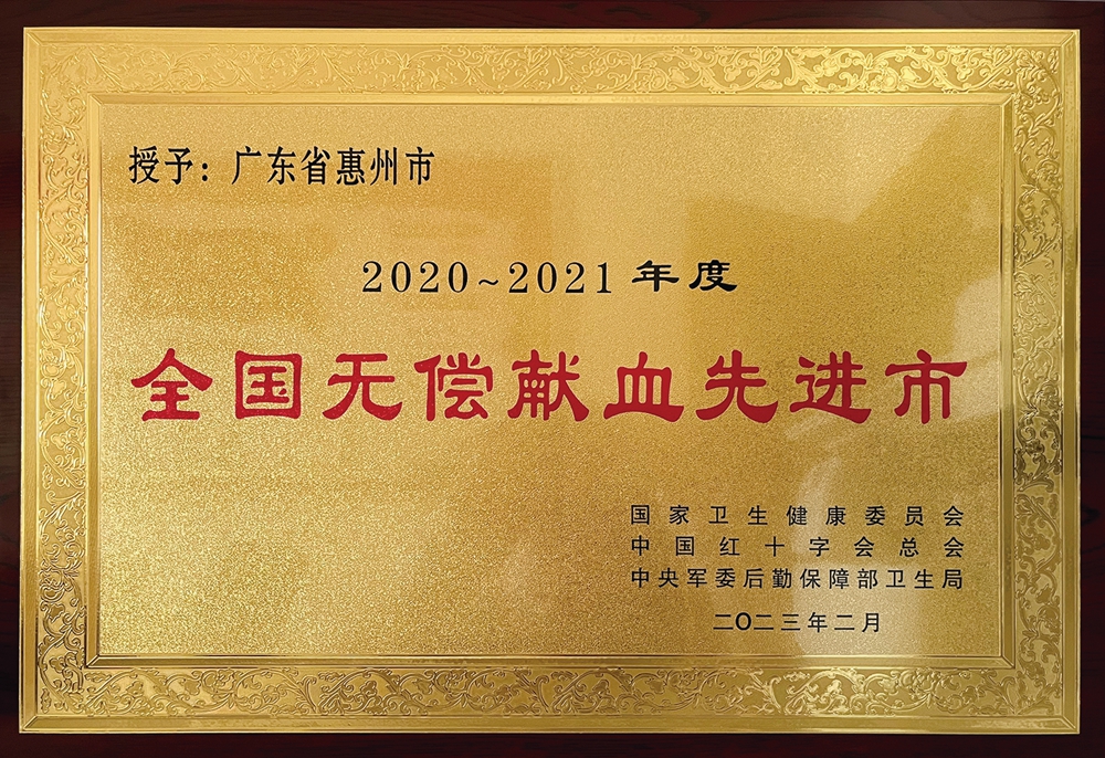 惠州市獲評2020~2021年度全國無償獻血先進市。市中心血站提供