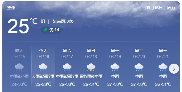 惠州日報(bào)訊 (記者周智聰 通訊員惠氣象宣)惠州市氣象臺6月15日17時20分發(fā)布惠州天氣實(shí)況及預(yù)報(bào),預(yù)計(jì)未來三天我市仍有較明顯降水,并伴有短時強(qiáng)降水、雷暴等強(qiáng)對流天氣。
