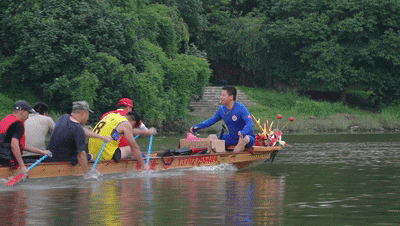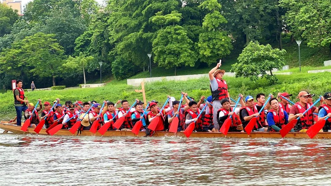 儀式過后,隨著陣陣鑼鼓聲和鞭炮聲,寮仔村隊(duì)員登上龍舟,隊(duì)員們精神抖擻,動(dòng)作整齊劃一,高喊口號(hào)努力劃槳。