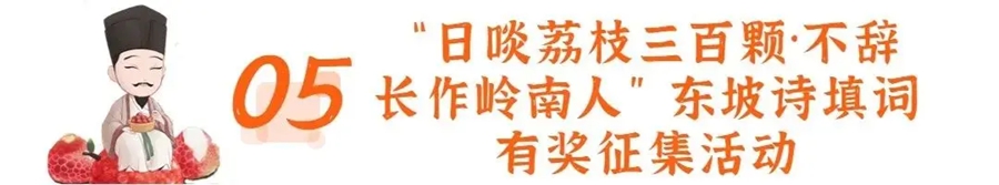 活動(dòng)內(nèi)容:東坡寓惠寫(xiě)下名詩(shī)《惠州一絕/食荔枝》,其中“日啖荔枝三百顆”寫(xiě)出了東坡因荔枝愛(ài)上嶺南,從此“不辭長(zhǎng)作嶺南人”。有獎(jiǎng)?wù)骷顒?dòng)目前已通過(guò)省、市媒體平臺(tái)發(fā)出兩項(xiàng)話題征集活動(dòng):以“因什么愛(ài)上嶺南”為話題,征集粉絲在推文下方填寫(xiě)“不辭長(zhǎng)作嶺南人”上聯(lián)內(nèi)容;以“狂炫荔枝三百顆會(huì)發(fā)生哪些趣事”為話題,征集填寫(xiě)“日啖荔枝三百顆”下聯(lián)內(nèi)容。點(diǎn)贊數(shù)最多的評(píng)論將獲評(píng)“最具人氣獎(jiǎng)”并頒發(fā)榮譽(yù)證書(shū);以動(dòng)畫(huà)、漫畫(huà)等方式創(chuàng)新填詞的,將有機(jī)會(huì)獲評(píng)“創(chuàng)意填詞獎(jiǎng)”并獎(jiǎng)勵(lì)相應(yīng)獎(jiǎng)金。