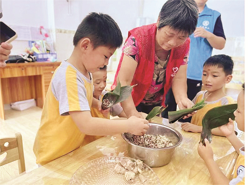 幼兒園小朋友和長(zhǎng)者們一起包粽子,盼世間美好都能接“粽”而至。 惠州日?qǐng)?bào)記者香金群 攝