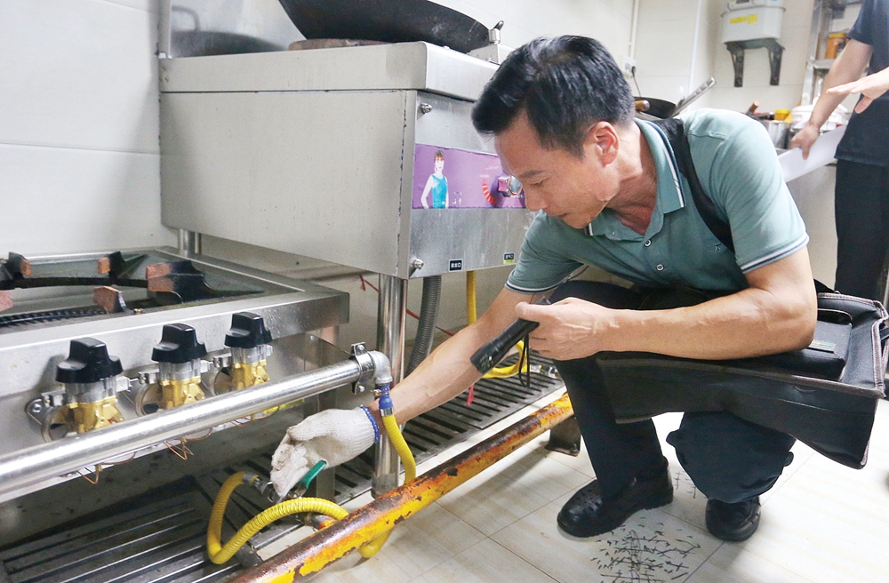 燃氣專家在檢查餐廳的廚房的燃氣灶及爐灶。 惠州日報記者 朱金贊 攝