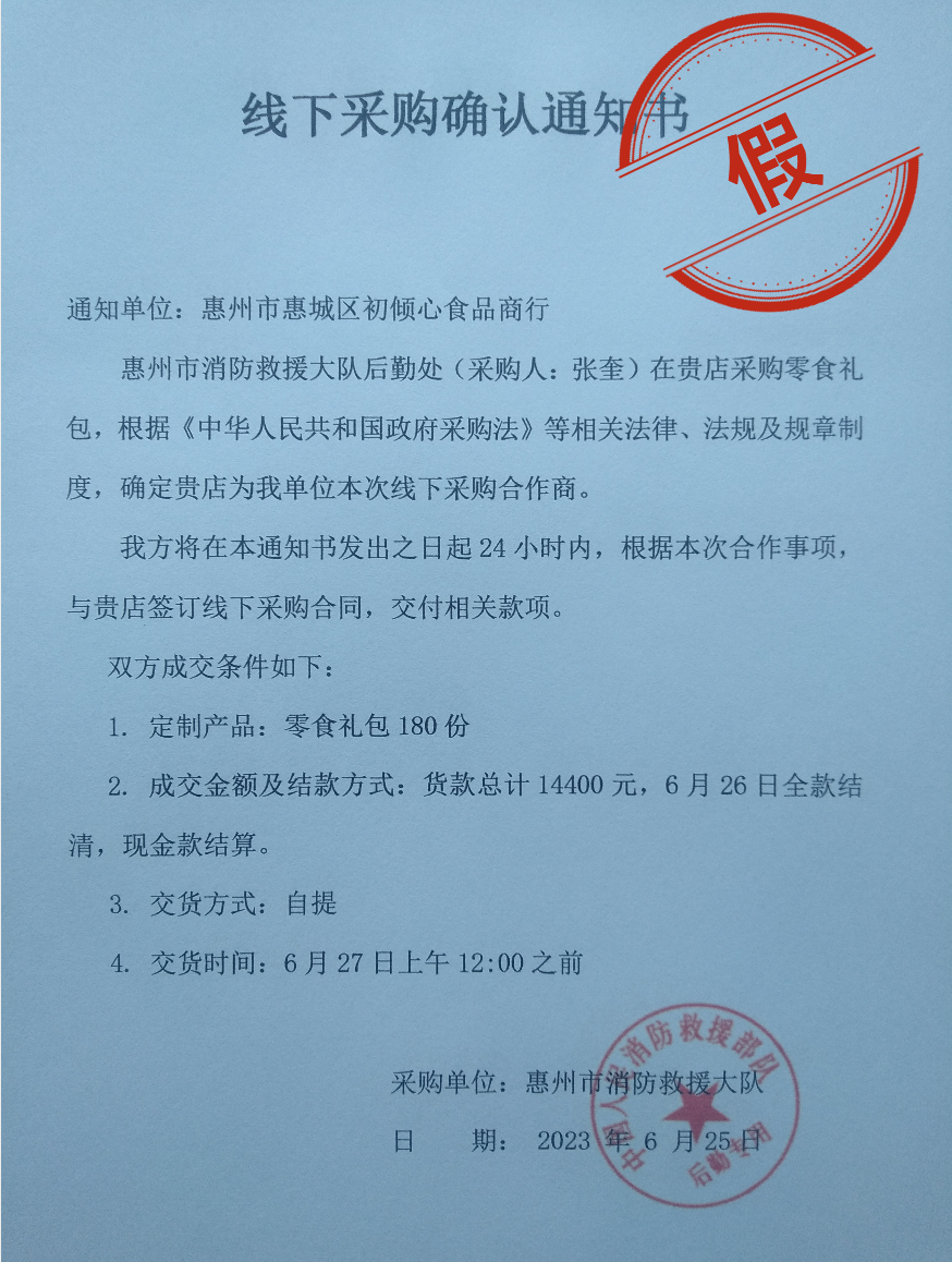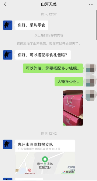 微信名為“山河無(wú)恙”的男子添加零食店店家微信后,發(fā)送了惠州市消防救援支隊(duì)的真實(shí)地址,并提供了一份蓋有“ 中國(guó)人民消防救援部隊(duì) 后勤專用章”的“線下采購(gòu)確認(rèn)通知書”。