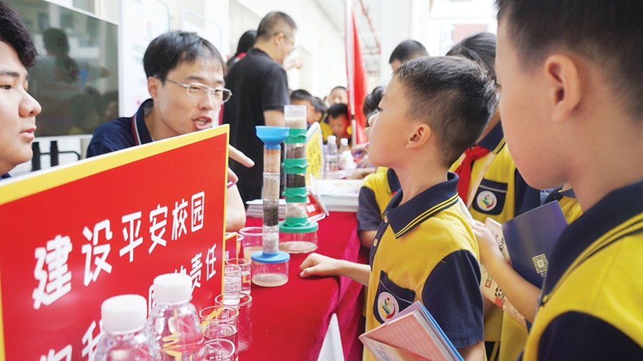 學生在安全宣講展區(qū)學習飲水安全知識;葜萑請笥浾叻段难 姜勁宇 見習記者蘇凌奕 通訊員羅志雄 攝