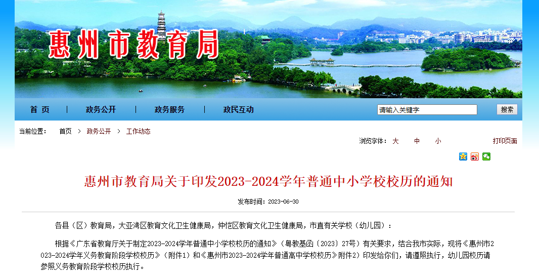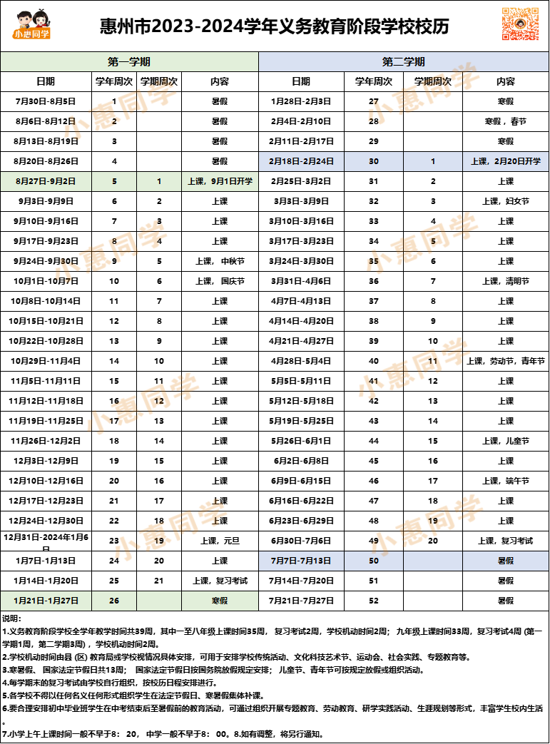 6月30日,《惠州市教育局關(guān)于印發(fā)2023~2024學(xué)年普通中小學(xué)校校歷的通知》發(fā)布,公布了惠州市2023~2024學(xué)年義務(wù)教育階段和普通高中學(xué)校校歷。其中,惠州中小學(xué)(義務(wù)教育階段)2023~2024學(xué)年第一學(xué)期將于9月1日開學(xué),2024年1月21日起放寒假。第二學(xué)期將于2024年2月20日開學(xué),2024年7月7日開始放暑假。