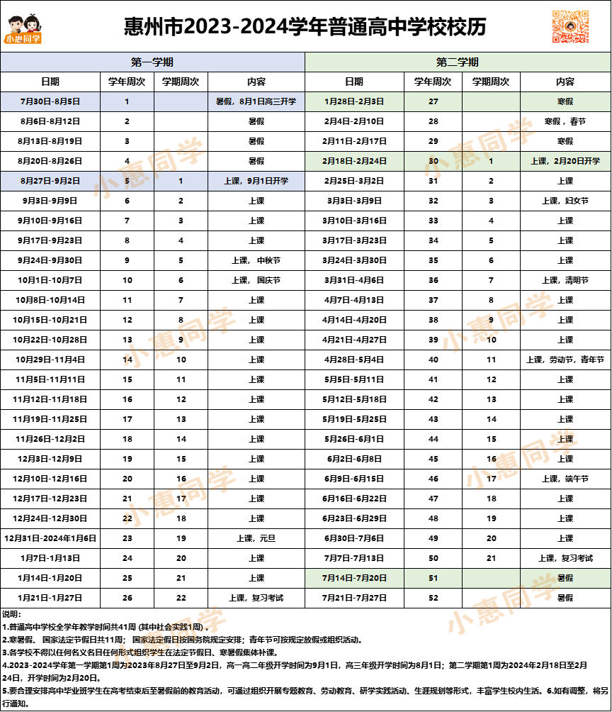 惠州普通高中學(xué)校2023~2024學(xué)年第一學(xué)期,高三學(xué)生將于8月1日開學(xué),高一高二學(xué)生將于9月1日開學(xué),2024年1月28日起放寒假。第二學(xué)期將于2024年2月20日開學(xué),2024年7月14日開始放暑假。