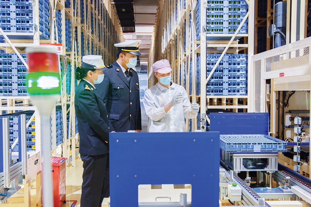 海關(guān)關(guān)員了解企業(yè)倉(cāng)儲(chǔ)設(shè)備運(yùn)行情況;葜萑?qǐng)?bào)記者劉煒煒 通訊員王旭 攝