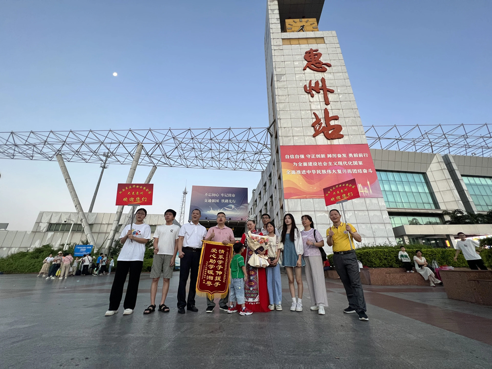 7月7日凌晨5時許,隨著惠州火車站列車靠站,從湖南湘西連夜趕來的土家族姑娘吳慶華一家四口走出站臺,她欣喜地?fù)肀е谀晟贂r資助她讀書的惠州熱心人士張鑒銘。