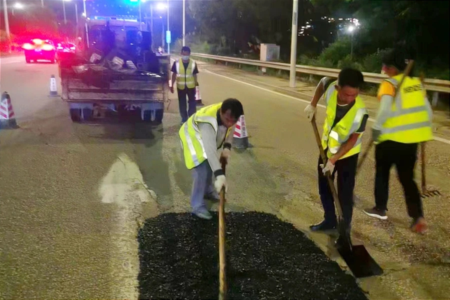 隨著夜幕降臨,惠博大道的車流量相對減少,市政園林工作人員來到惠博大道,緊鑼密鼓開展路面破損修復(fù)!盀榱瞬挥绊懡煌ㄍㄐ泻桶踩,我們目前只能進(jìn)行一些小修小補(bǔ)!惫ぷ魅藛T告訴記者,惠博大道上的病害是動態(tài)性的,尤其是南方多雨天氣下,接連不斷的雨水更容易破壞瀝青結(jié)構(gòu)。因此,雨天后的病害會更加明顯,修補(bǔ)過瀝青的坑洞也容易再次出現(xiàn)坑槽、裂縫,他們經(jīng)常趁著雨后,用冷補(bǔ)材料“縫補(bǔ)”修復(fù)。