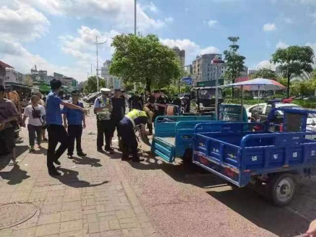 7月11日下午,針對位于居民區(qū)中心的龍湖市場周邊占道經(jīng)營、三輪貨運車亂擺放等行為存在安全隱患、交通擁堵、衛(wèi)生臟亂差等問題,惠州市公安局交警支隊江東大隊聯(lián)合城管部門,出動執(zhí)法車輛5輛,對市場周邊的占道攤位、三輪車開展了集中勸導(dǎo)和整治工作。