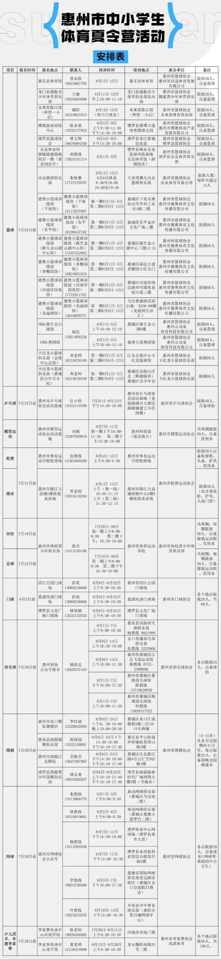 惠州市中小學(xué)生們,又一個快樂學(xué)習(xí)的機(jī)會來了!為推動我市全民健身活動及學(xué)校陽光體育運(yùn)動的廣泛開展,豐富學(xué)生假期生活,市文化廣電旅游體育局將于暑假期間舉辦2023年惠州市中小學(xué)生體育“夏令營”活動,對本市初中、小學(xué)生進(jìn)行相關(guān)運(yùn)動技能培訓(xùn)。