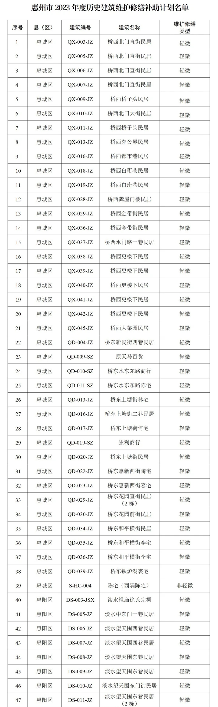 歷史建筑不僅是建筑史的見證,也是一地區(qū)地域特性、文化特色和城市記憶的載體,反映了整個城市的發(fā)展歷程。7月13日,市住建局發(fā)布《惠州市2023年度歷史建筑維護修繕補助計劃名單》,對擬列入補助計劃的141處歷史建筑進行公示。