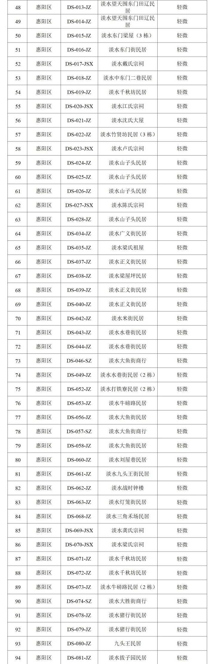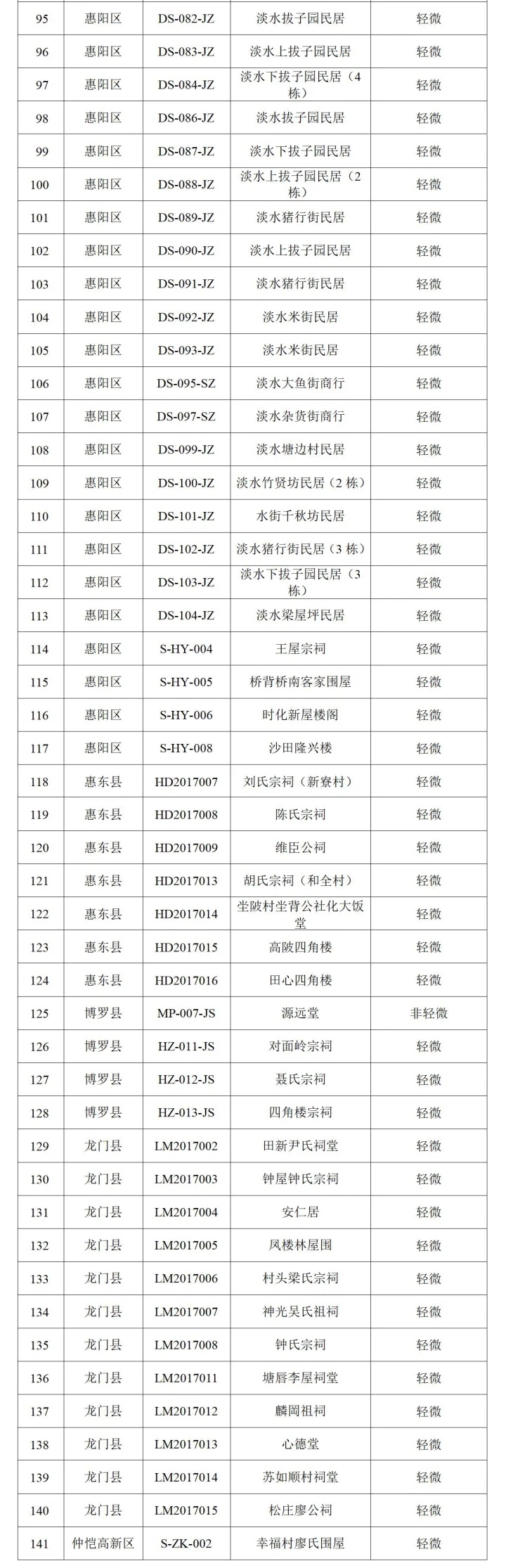 根據(jù)名單,141處需修繕的歷史建筑中主要集中在惠城區(qū)和惠陽區(qū),共有117處。除于惠城區(qū)的陳宅(西隅陳宅)以及博羅縣的源遠堂為非輕微修繕外,其余139處均為輕微修繕。