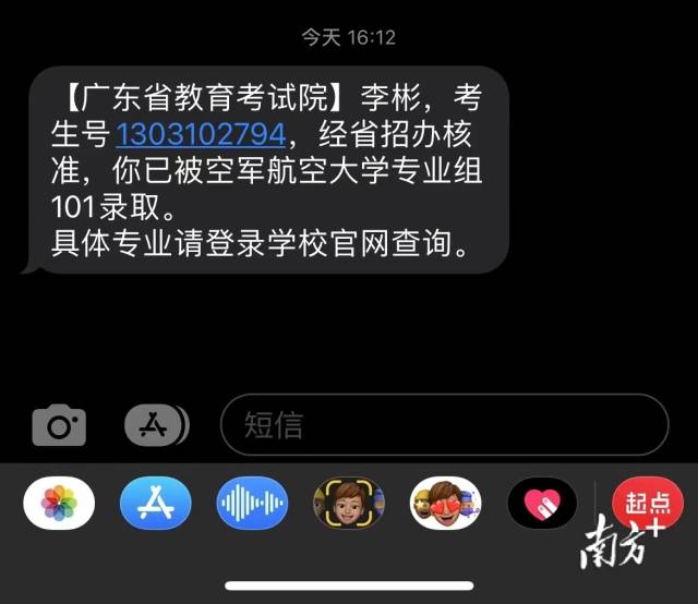 李彬收到的錄取短信。