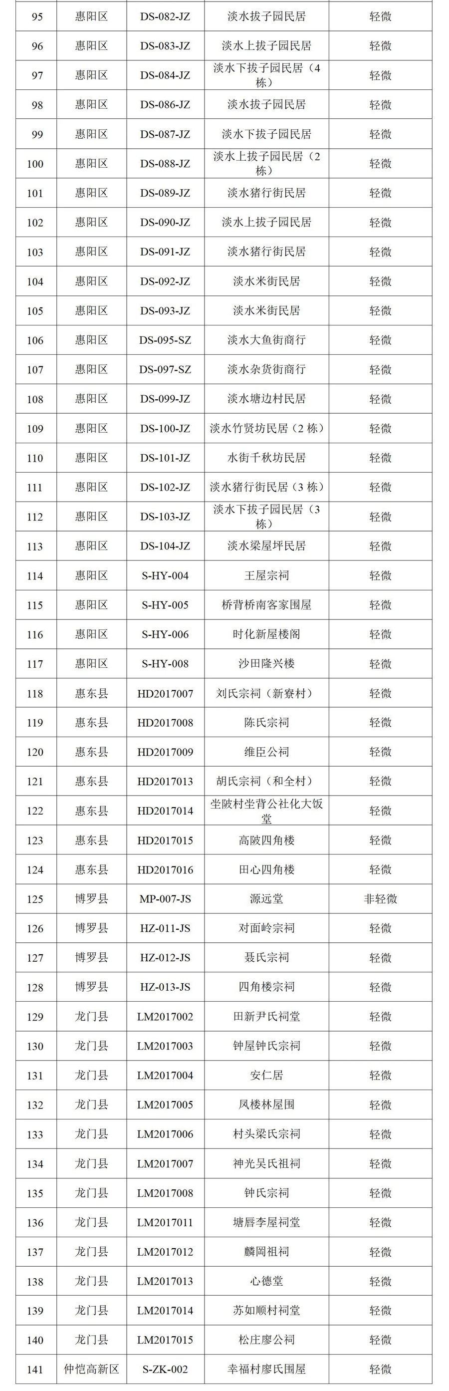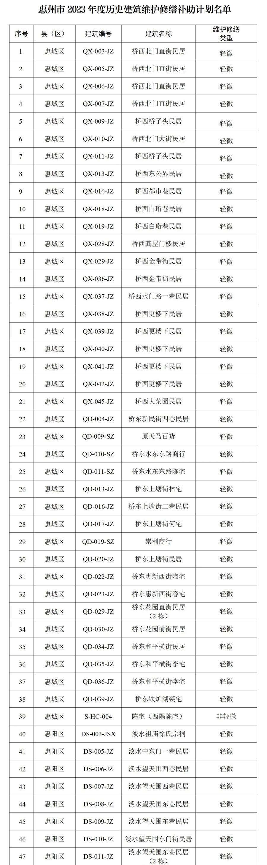 根據(jù)歷史建筑保護(hù)責(zé)任人申請(qǐng),經(jīng)縣(區(qū))核實(shí)和專家論證評(píng)審,市住建局匯總了2023年度擬列入市級(jí)財(cái)政維護(hù)修繕補(bǔ)助計(jì)劃的歷史建筑名單,共有141處歷史建筑列入補(bǔ)助計(jì)劃。141處需修繕的歷史建筑主要集中在惠城區(qū)和惠陽區(qū),共有117處。除惠城區(qū)的陳宅(西隅陳宅)以及博羅縣的源遠(yuǎn)堂為非輕微修繕外,其余139處均為輕微修繕。