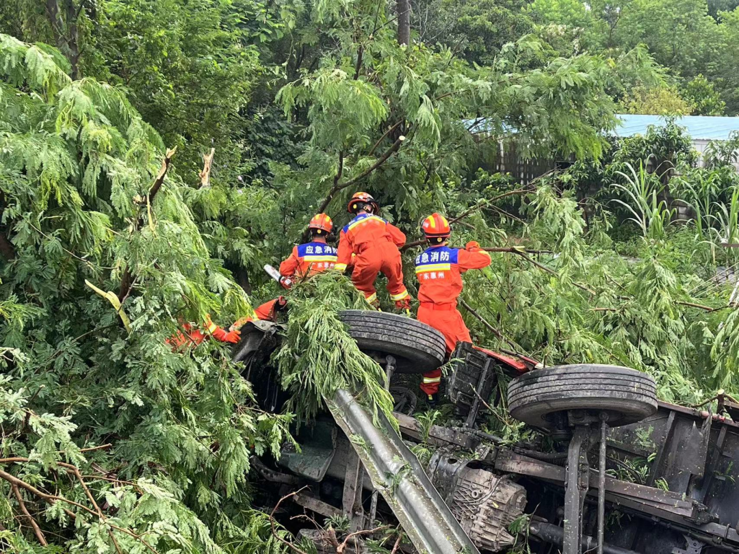 通過喊話溝通了解,被困人員只有一名,意識(shí)清醒但無法自行脫困。車頭部分被樹木阻礙,人員難以通行。指揮員立即評(píng)估救援方案,利用機(jī)動(dòng)鏈鋸對(duì)車頭左側(cè)門上方障礙物進(jìn)行破拆開辟救助通道,營(yíng)救被困人員。