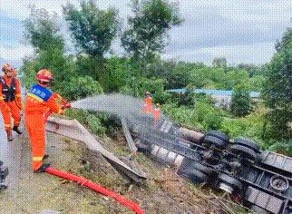 指揮員首先安排救援人員出一只水槍進(jìn)行對(duì)漏油油箱稀釋,隨后帶領(lǐng)兩名救援人員對(duì)側(cè)翻車輛情況展開偵查。