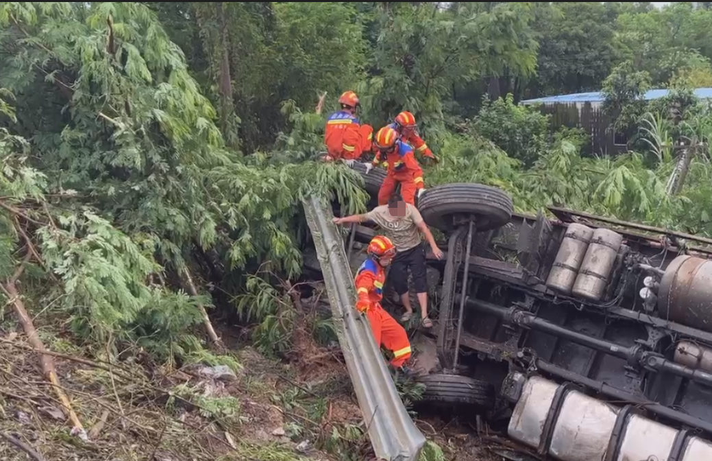 消防員詢問知情人得知,現(xiàn)場(chǎng)為一輛物流貨車沖出護(hù)欄發(fā)生側(cè)翻,車輛有油箱漏油現(xiàn)象,車上人員情況不明。