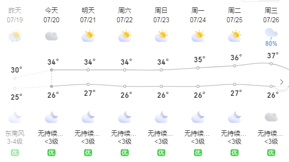 20日,粵西和珠江三角洲市縣多云,有分散(雷)陣雨局部大雨,其余市縣多云,局部有(雷)陣雨。最高氣溫:粵北和珠江三角洲北部市縣31℃~34℃,其余市縣29℃~31℃。