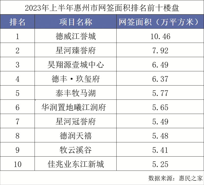 惠民之家數(shù)據(jù)研究中心公布數(shù)據(jù)顯示,2023年上半年惠州市網(wǎng)簽面積排名前十的樓盤(pán)分別是德威江譽(yù)城(10.46萬(wàn)㎡)、星河臻譽(yù)府(7.92萬(wàn)㎡)、昊翔源壹城中心(6.49萬(wàn)㎡)、德豐·玖璽府(6.37萬(wàn)㎡)、泰豐牧馬湖(5.77萬(wàn)㎡)、華潤(rùn)置地曦江潤(rùn)府(5.65萬(wàn)㎡)、星河冠譽(yù)府(5.49萬(wàn)㎡)、德潤(rùn)天禧(5.48萬(wàn)㎡)、牧云溪谷(5.41萬(wàn)㎡)、佳兆業(yè)東江新城(5.25萬(wàn)㎡)。