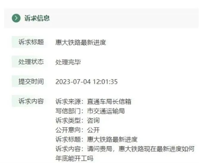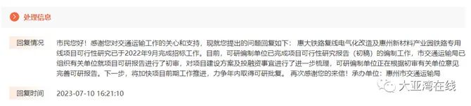 7月10日,市交通局也在網(wǎng)絡(luò)問政中做出了回復(fù):“惠大鐵路復(fù)線電氣化改造及惠州新材料產(chǎn)業(yè)園鐵路專用線項目可行性研究已于2022年9月完成招標(biāo)工作。目前,可研編制單位已完成項目可行性研究報告(初稿)的編制工作,市交通運(yùn)輸局已組織有關(guān)單位就項目可研報告進(jìn)行了初審,對項目建設(shè)方案及投融資事宜進(jìn)行了進(jìn)一步梳理,可研編制單位正在根據(jù)初審有關(guān)單位意見完善可研報告。下一步,將加快項目前期工作推進(jìn),力爭年內(nèi)取得可研批復(fù)!