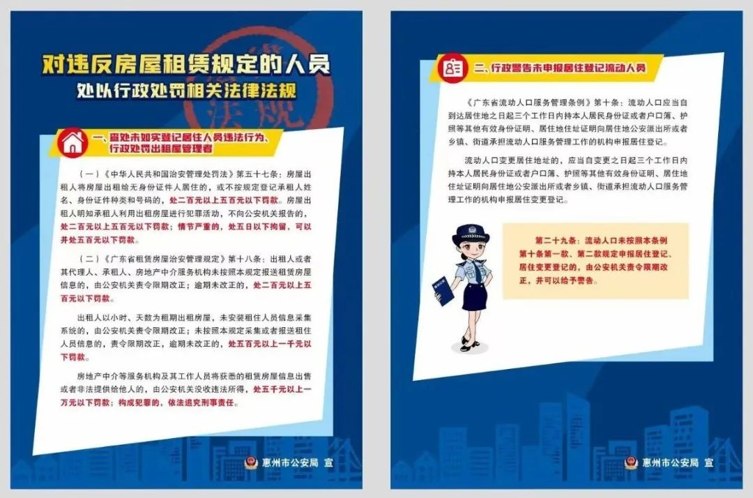 惠州公安提醒您:出租房屋未依規(guī)登記承租人信息的要被處罰喔請記得收租的同時依規(guī)登記承租人信息!