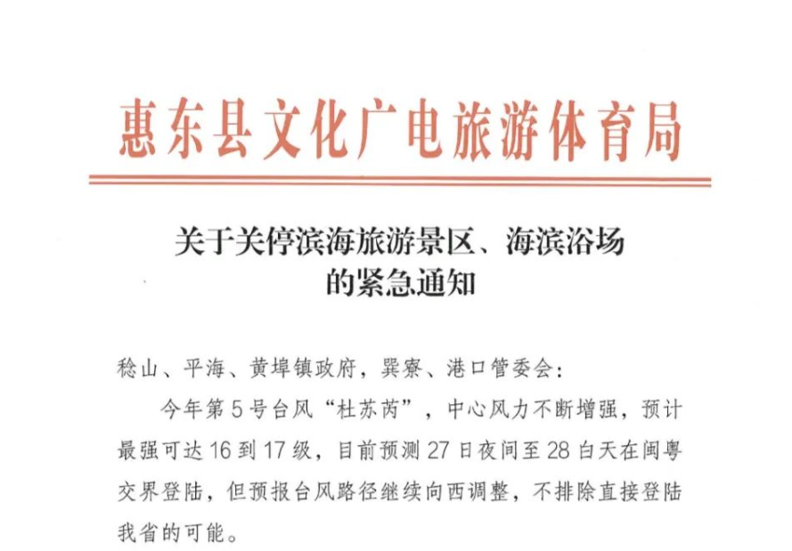 海龜灣旅游區(qū)、巽察旅游度假區(qū)、平海溫泉度假區(qū)等A級景區(qū)及雙月灣觀景臺、黑排角地質(zhì)公園等濱海旅游景區(qū),海濱泳場,海島游于7月25 日12 時起暫停對外開放,開放時間另行通知。