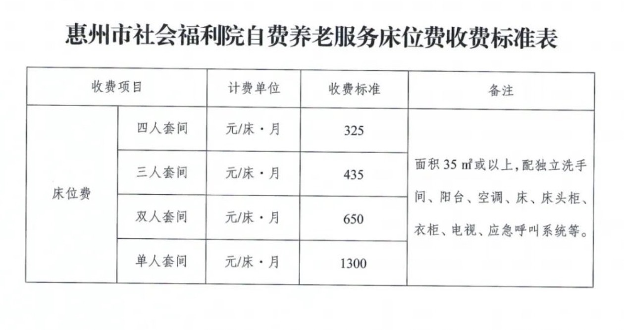 日前,惠州市發(fā)展和改革局、惠州市民政局公布《關(guān)于調(diào)整惠州市社會福利院自費養(yǎng)老服務(wù)床位費收費標(biāo)準(zhǔn)的批復(fù)》。自今年8月1日起,惠州市社會福利院將上調(diào)社會老人養(yǎng)老床位的收費標(biāo)準(zhǔn)。