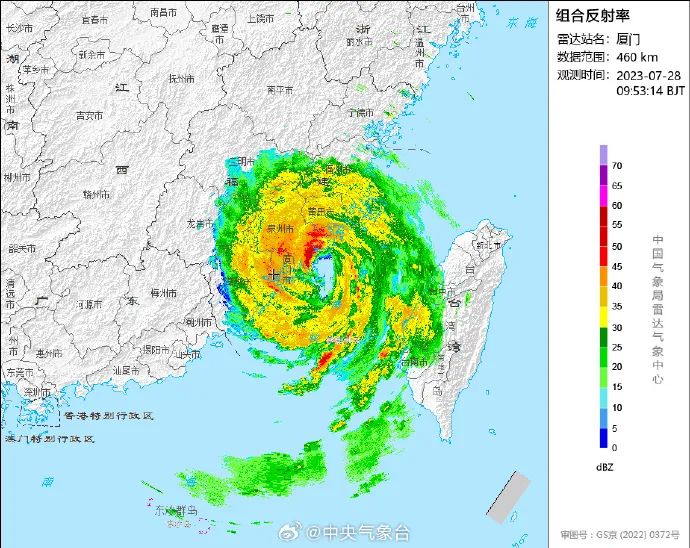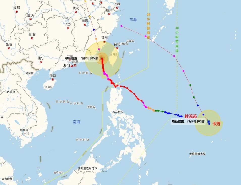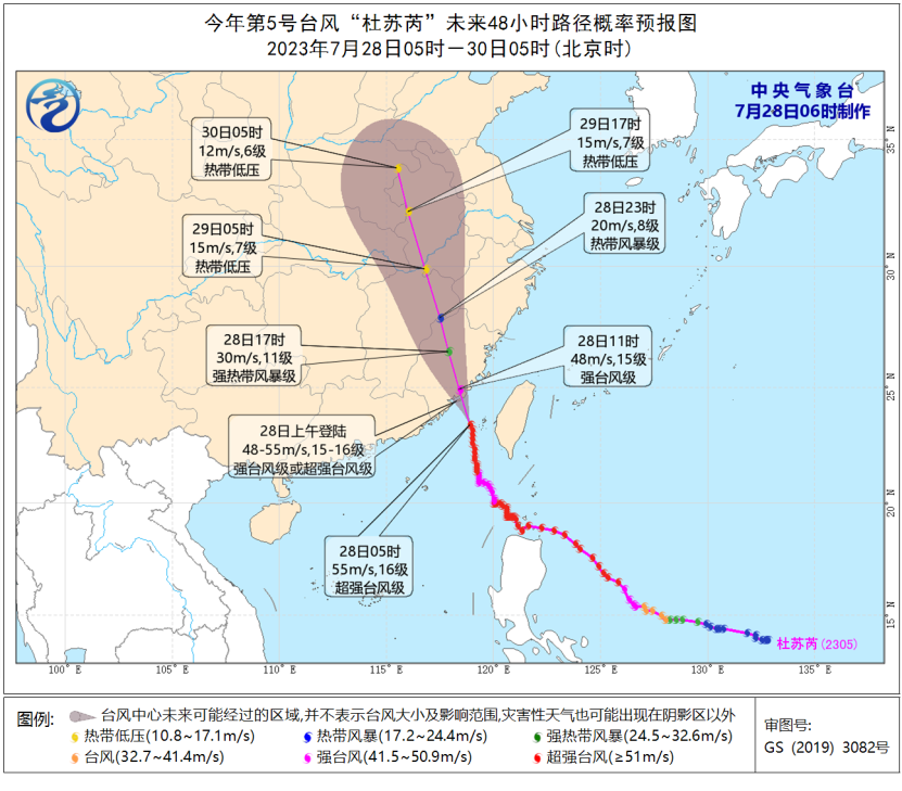28日08時至29日08時,巴士海峽、南海東部和南部、臺灣以東洋面、臺灣海峽、東海大部,以及臺灣島及其沿海、福建及其沿海、浙江及其沿海、江西東部、江蘇沿海、上海及其沿海、廣東東部沿海將有5-7級風(fēng)、陣風(fēng)8-9級,其中南海東北部偏東海域、臺灣海峽、福建南部的部分地區(qū)及沿海、臺灣島西部沿海風(fēng)力可達(dá)8-12級、陣風(fēng)13-15級,“杜蘇芮”中心經(jīng)過的附近海域風(fēng)力可達(dá)13-16級,陣風(fēng)17級及以上。